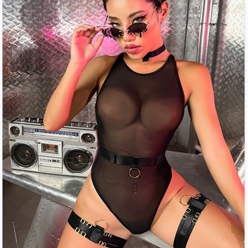 Kolsuz kadın seksi fermuar Bodysuit şeffaf ağ deri iç çamaşırı ücretsiz boyutu